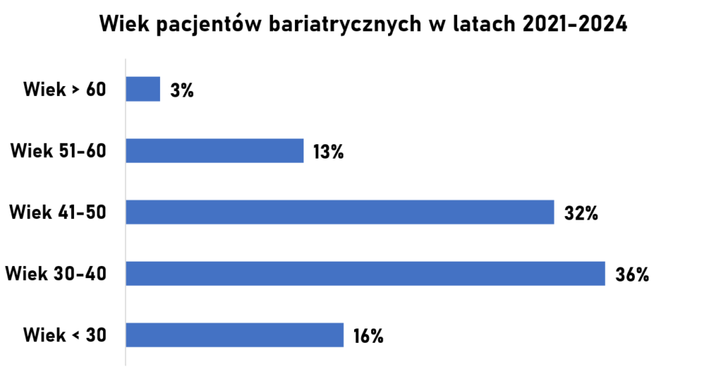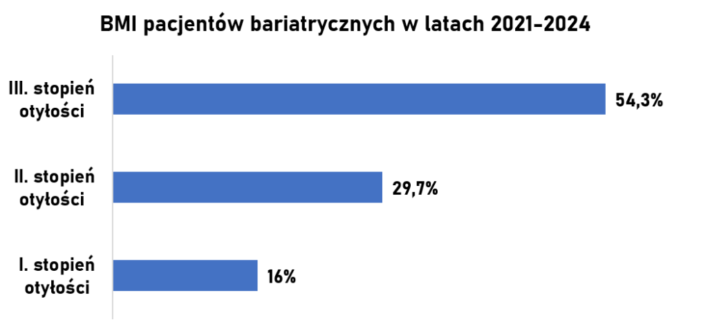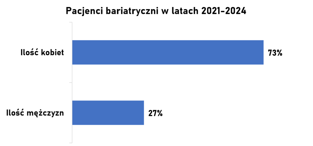Operacje pacjentów bariatrycznych wykonujemy w Klinice Chirurgii Ogólnej i Małoinwazyjnej od 2021 roku. Od tego czasu wykonaliśmy już ponad 1800 operacji bariatrycznych. Najwięcej pacjentów zakwalifikowano do wykonania rękawowej resekcji żołądka (sleeve gastrectomy). Kwalifikujemy pacjentów z różnym stopniem otyłości. Do programu KOS-BAR mogą przystąpić osoby, u których wskaźnik masy ciała BMI>40 oraz osoby z BMI 35-40, u których występują choroby współistniejące wywołane otyłością.
