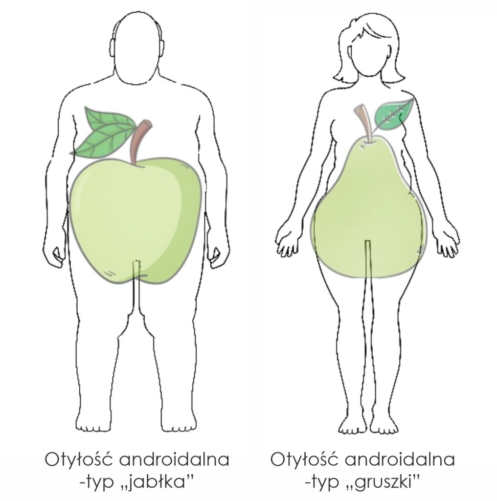 Otyłość brzuszna zwiększa ryzyko nadciśnienia tętniczego, cukrzycy typu 2 i miażdżycy. Natomiast otyłość pośladkowo-udowa zwiększa ryzyko nowotworów przewodu pokarmowego i hormonozależnych (macicy, piersi, jajnika).