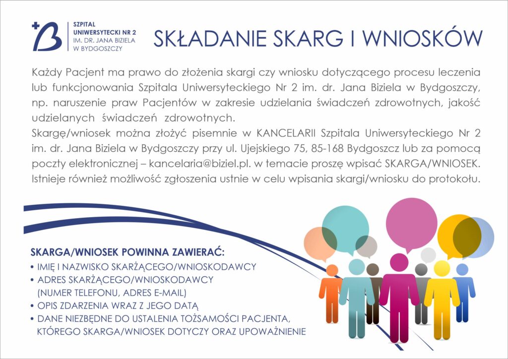 Skargę lub wniosek można złożyć w Szpitalu Uniwersyteckim Nr 2 im. dr Jana Biziela w Bydgoszczy przy ul. Ujejskiego 75, 85-168 Bydgoszcz w KANCELARII Szpitala: