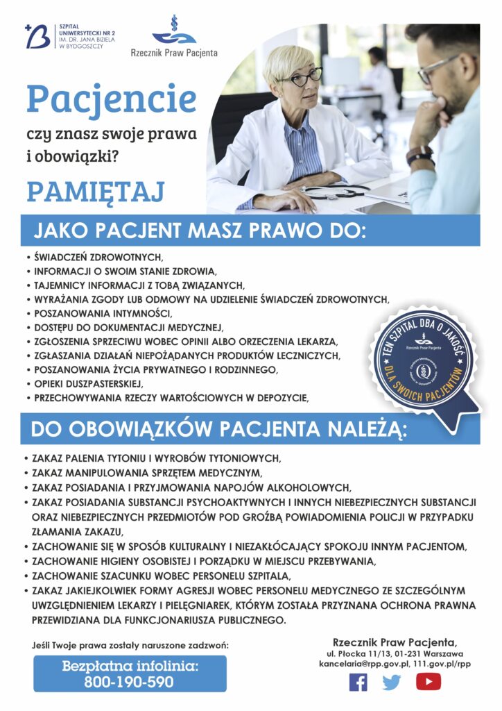 Prawa pacjenta wynikają z obowiązujących w tym zakresie przepisów prawa, w szczególności z ustawy o Prawach Pacjenta i Rzeczniku Praw Pacjenta (poniżej do pobrania). Zbiór praw pacjenta jest umieszczony także w ogólnodostępnym i widocznym miejscu, np. na tablicy informacyjnej w poszczególnych Klinikach/ Oddziałach Klinicznych/Oddziałach oraz innych jednostkach i komórkach organizacyjnych udzielających świadczeń zdrowotnych.